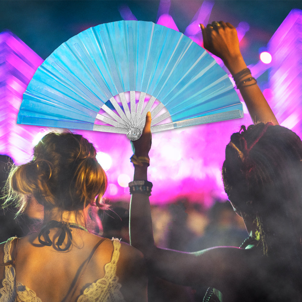 Our Large Iridescent Fairy Dust Blue Hand Fan is the perfect accessory for keeping cool indoors & outdoors.