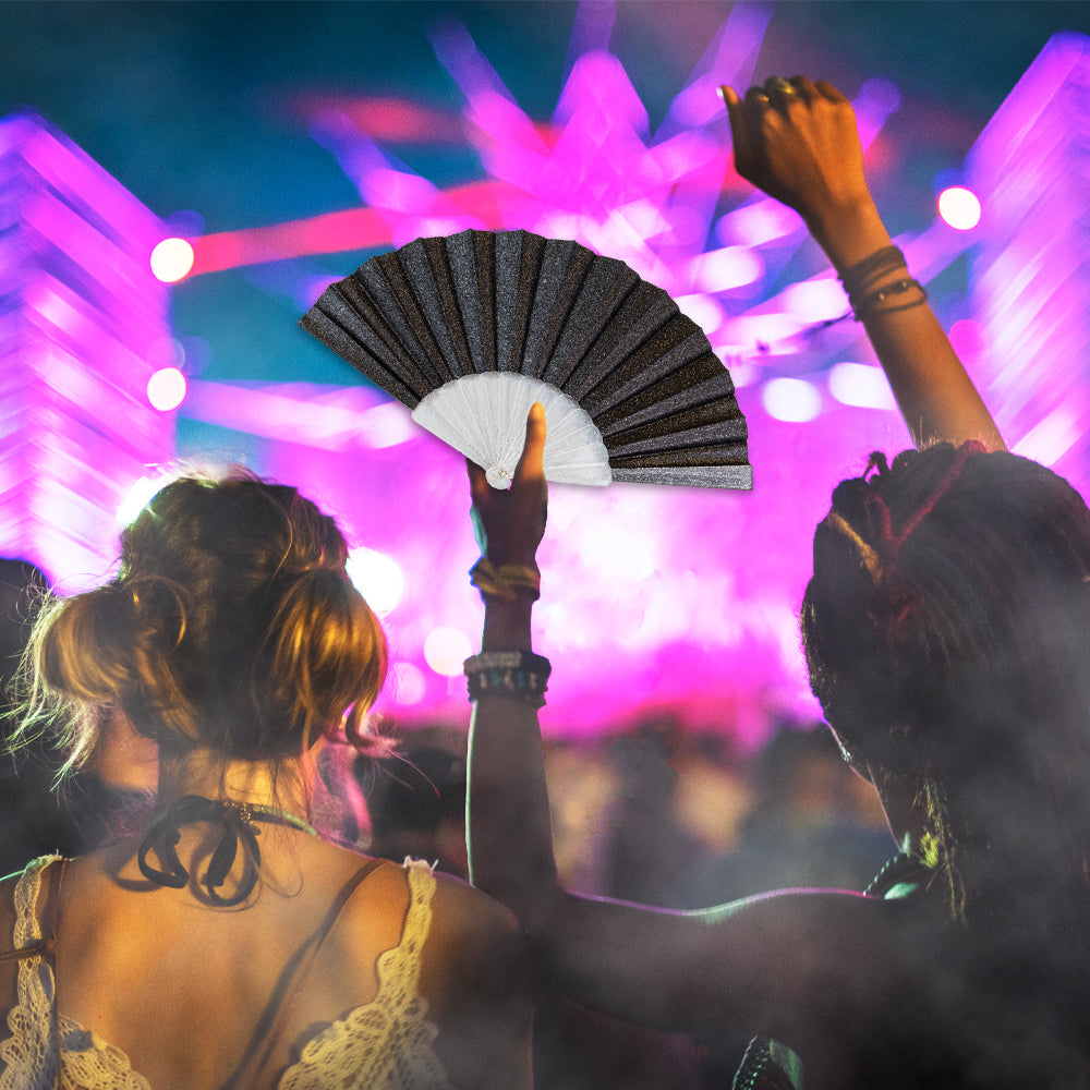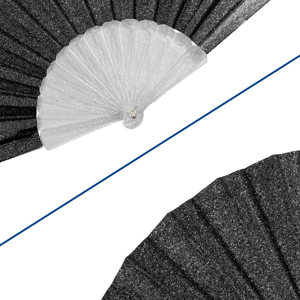 Our Glitter Black Small Hand Fan with a clear handle is designed to keep you comfortably cool wherever you go. Measuring 16.5 inches fully opened with 9-inch arms, it offers a compact yet effective breeze. The vibrant, digitally printed design spans 13 spokes of durable polyester fabric, ensuring lasting color and clarity. Its sturdy plastic handle features a smooth, screw-less rivet hinge for easy use, and a charm loop allows you to add a personal touch. This fan combines style, durability, and convenience for everyday comfort.
